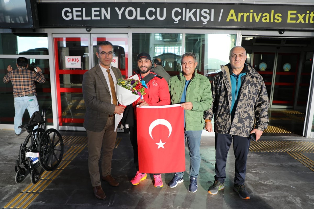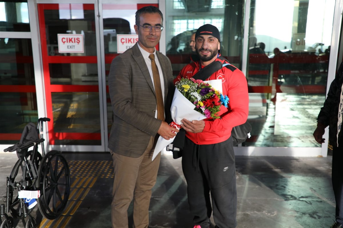 Başarılı bedensel engelli sporcuyu ,Ağrı Ahmed-i Hani Havalimanı'nda; Gençlik ve Spor İl Müdürü Fedai Din, Spor Şube Müdürü Turan Tunç ve Antrenör Çetin Demir çiçeklerle karşıladı.